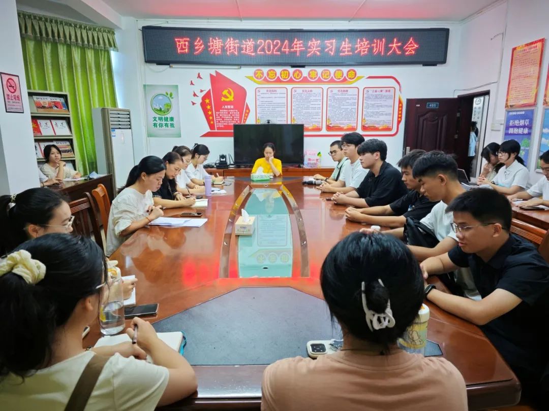 在西乡塘街道办,街道团工委盘玲麟书记对同学们的到来表示热烈的欢迎,并主持召开了实习生培训大会。盘书记详细介绍了西乡塘街道的基本情况,逐一阐述了实习岗位的内容和要求,让同学们更加清晰地了解实习生活。同时,盘书记还提醒同学们于实习期间的注意事项,鼓励大家珍惜机会,圆满完成实习任务。雷文艳老师则强调了社区工作作为社会治理的基本单元和连接服务群众的“最后一公里”的重要性,鼓励同学们在实践中展现公管学子的青春风采。