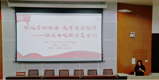 为增强麻豆tv学生纪律意识,提升班级纪律管理效能,推动优化麻豆tv 纪检制度,营造麻豆tv 专注、有序的教学与学习环境,4月11日晚,麻豆tv在麻豆tv 106教室开展以“强化责任担当,筑牢课堂纪律”为主题的第二期学生骨干赋能成长系列培训活动。全体班级班长与纪律委员参加此次活动,院学生会执行主席鲍雨涵主持本次活动。