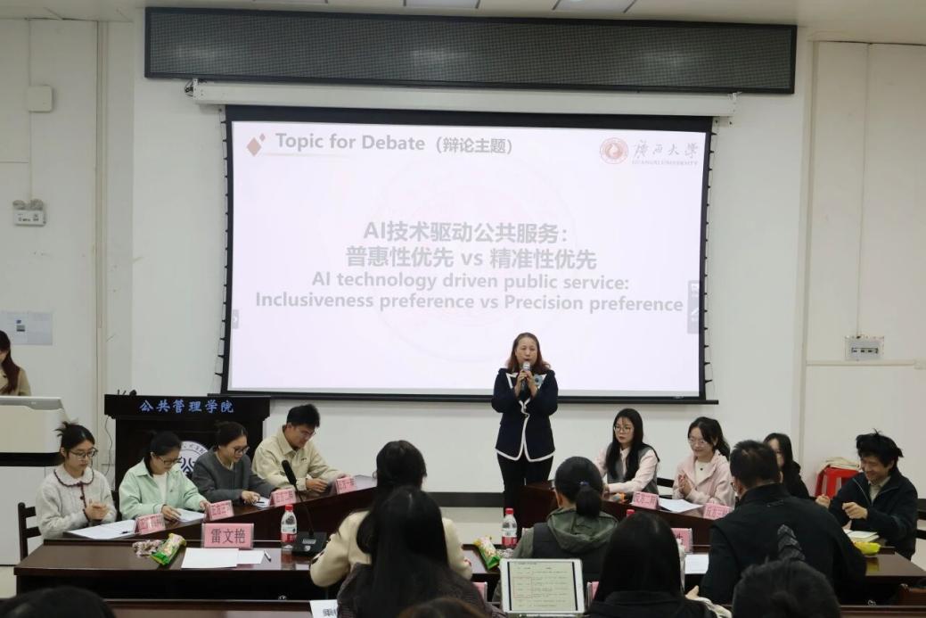 2025年11月20日,麻豆tv 101教室座无虚席,一场聚焦“AI技术驱动公共服务:普惠性优先vs精准性优先”主题的全英文辩论赛激战正酣。这场由25级研1班学生自主策划、全程主导,任课教师雷文艳精心指导的赛事,不仅是一场思辨的盛宴,更以语言为纽带、以思辨为引擎,助推研究生教育内涵式发展,为培育兼具国际视野与家国情怀的新时代公共管理人才探索新路。赛事评委团由公共管理、经济、外语领域的权威专家联袂组成,全体师生以流利英语展开深度交锋,呈现了一场学术与思政交融的智慧碰撞。