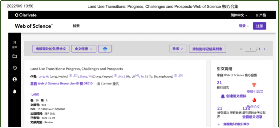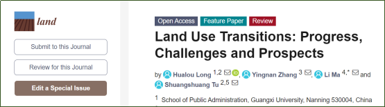该论文题为“土地利用转型:研究进展、挑战和展望”(Land Use Transitions: Progress, Challenges and Prospects),发表在SSCI期刊《Land》(JCR 2区,IF 2021=3.905)。土地利用转型研究业已成为深入了解人地关系、揭示社会经济发展问题及其环境效应的关键切入点。本文基于文献计量分析和传统文献综述方法对20多年来土地利用转型研究的总体概况、重点领域和热点问题进行了系统分析,并对未来的发展趋势进行了展望,以期为区域及全球的土地资源可持续利用与管理提供科学支撑。