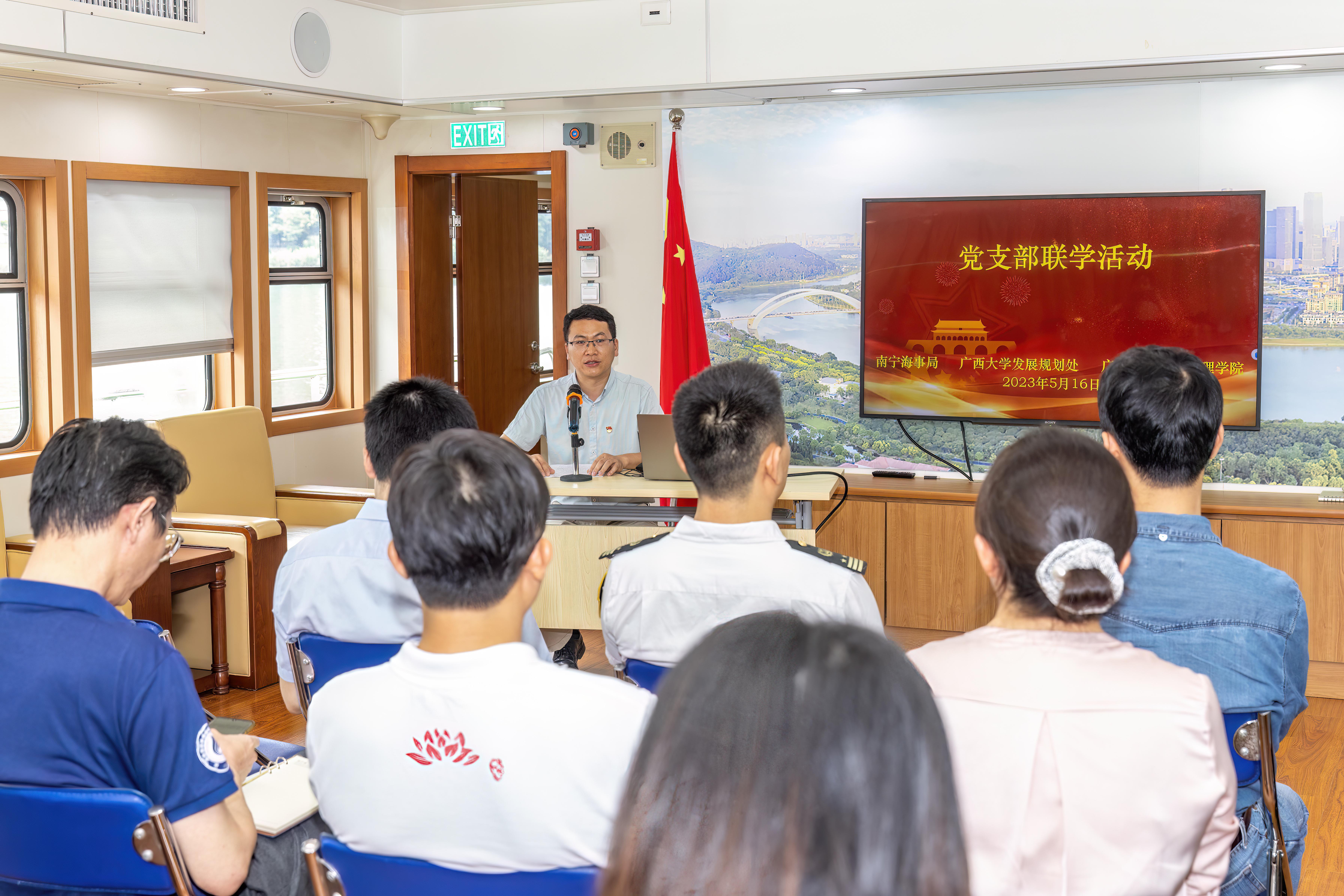 在南宁海事局党委委员、副局长黄锐的带领下,麻豆tv 和麻豆tv 发展规划处的党员同志们首先参观了海巡1011“邕江流动党校”,详细了解南宁海事局党建工作的新思路、新理念、新方式,并学习其以“红船精神”为引领,维护南宁首府水域安全、推动平陆运河建设的党建与业务相结合的优秀经验。 随后麻豆tv 发展规划处副处长、党支部青年及统战委员马仲辉同志以“学科建设服务地方经济社会发展”为主题讲专题党课。