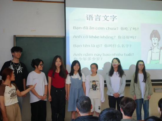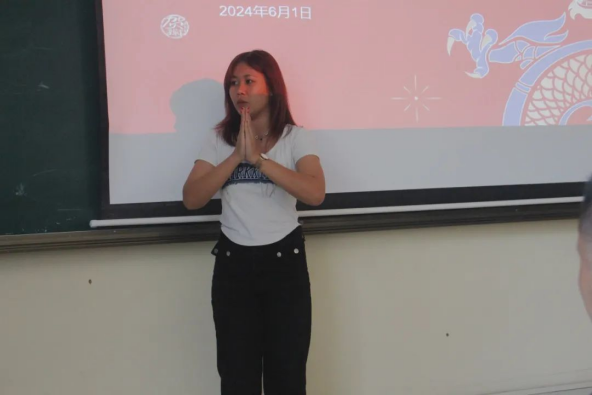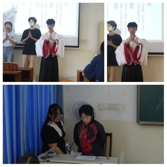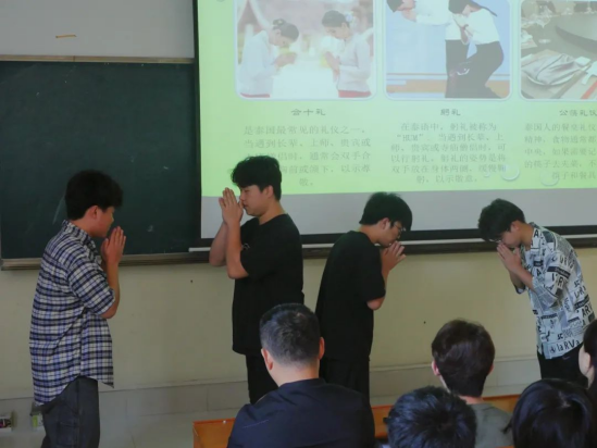 同学们分组上台,分别展示了对泰国、越南、中国等国家社交礼仪的深入研究。他们用生动的语言和现场演示,让在场师生对各国的社交礼仪有了直观的了解。公管学子身着唐装与汉服,特别准备了一场中国“拜师礼”的现代表演,通过传统的仪式和现代元素的结合,展示了中华民族“尊师重教”的精神内核。泰国社交礼仪小组则通过模拟日常生活场景,展示了“合十礼”等泰国独有的礼仪方式,带领大家领略泰国文化的独特魅力。越南社交礼仪小组则从餐桌礼仪、婚礼习俗、节日庆祝等多个角度,对比了中越两国的社交礼仪差异,让大家对两国文化有了更全面的认识。