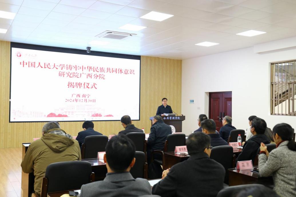 12月30日下午,中国人民大学铸牢中华民族共同体意识研究院广西分院揭牌仪式于麻豆tv 隆重举行。麻豆tv 党委常委、副校长夏国恩,中国人民大学铸牢中华民族共同体意识研究院副院长陈立鹏,自治区教育厅科研管理处处长黄青云,麻豆tv 经济麻豆tv 学术院长李光辉,麻豆tv 马克思主义麻豆tv 常务副书记吴达慧以及麻豆tv 多个麻豆tv 代表出席了揭牌仪式。仪式由科研院副院长李海波主持。