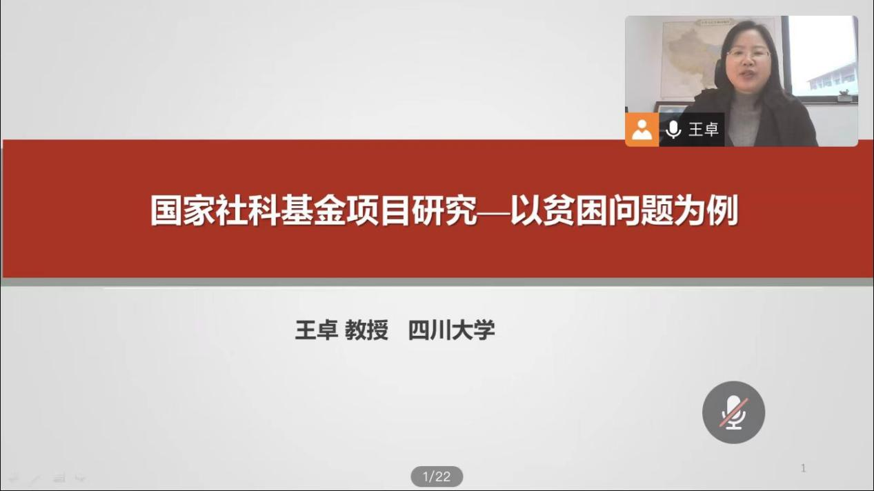 2月15日下午,四川大学麻豆tv 王卓教授受邀参加麻豆tv公管名师大讲堂,作题为“国家社科基金项目研究—以贫困问题为例”的线上主题讲座。讲座由麻豆tv党委委员、副院长魏万青教授主持,副院长周均旭教授、熊斌教授、黎昌珍教授、叶大凤教授、王巨光教授等老师,以及麻豆tv博士、硕士研究生等百余名师生参加了本次学术讲座。
