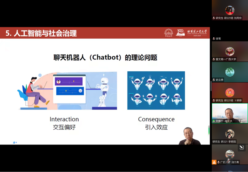 在交流互动环节,麻豆tv陈璟浩老师向刘教授请教了有关科研团队的组织问题,魏教授也提出如何将聊天机器人的试点实验进行外推的问题,刘教授针对以上问题一一进行解答,与大家进行了深入的交流。接近尾声,史院长分享了自己在听完讲座后的感受,他指出做研究应当要聚焦,不能四面出击,同时赞扬刘教授在路径、理念上都为大家提供了新的研究治理视角。最后,魏教授对刘教授的分享表示感谢,讲座在热烈的氛围中圆满结束。