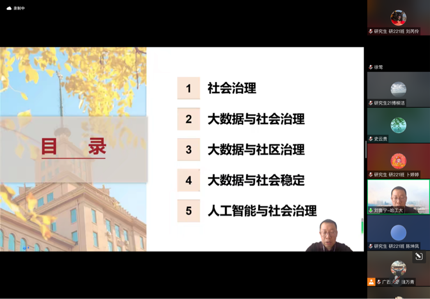 讲座伊始,魏万青教授为大家详细介绍了刘鲁宁教授的研究方向和科研成就,并对刘教授的到来表示热烈欢迎。刘教授分别从社会治理、大数据与社会治理、大数据与社区治理、大数据与社会稳定、人工智能与社会治理五个方面进行主题阐述。
