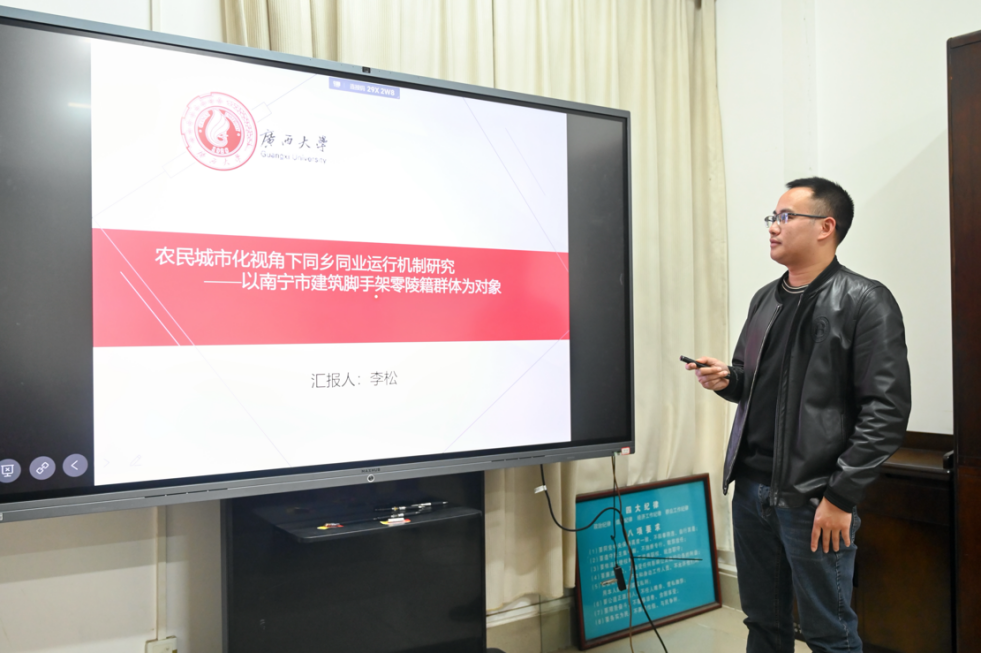 李松同学分享的题目为《农民城市化视角下同乡同业运行机制研究——以南宁市建筑脚手架零陵籍群体为对象》。他深入探讨了中国普遍存在的“同乡同业”社会经济现象,选取在广西南宁从事建筑脚手架行业的湖南零陵人为研究个案,以社会资本理论、可持续生计框架以及社会支持理论为核心理论工具,探讨同乡同业农民在城市化进程中面临的生计模式可持续性问题、城市生活融入问题以及社会支持问题。