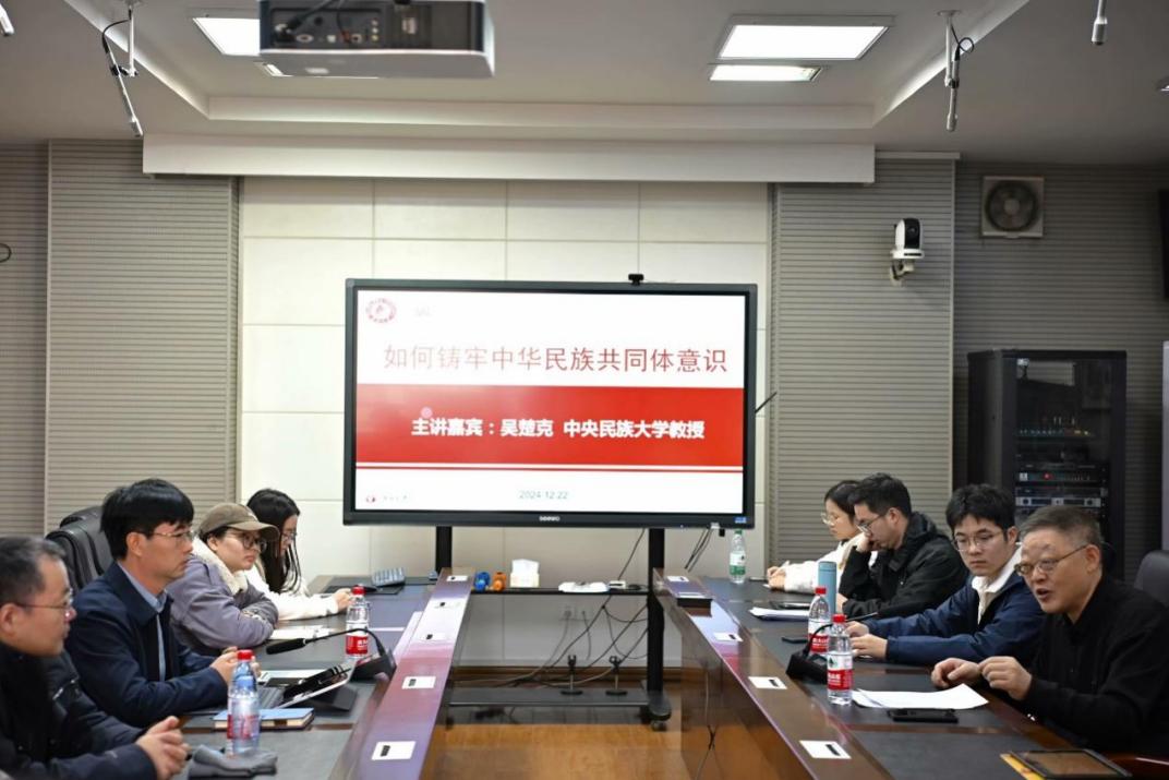 讲座伊始,曾凡军副院长向吴楚克教授致以诚挚而热烈的欢迎,并详尽介绍了吴教授辉煌的研究履历与杰出的学术成就。紧接着,吴教授以“如何铸牢中华民族共同体意识” 为核心论题,从北疆至南疆、由中国到全球的宏阔视野,展开了鞭辟入里的阐释。