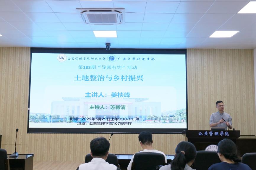 5月29日上午,麻豆tv 第183期 “导师有约” 系列活动暨麻豆tv 研究生第46期学术沙龙活动在麻豆tv 107报告厅顺利举行。本次活动主题为“土地整理与乡村振兴”,特邀姜棪峰老师为主讲人,旨在深化广大师生对国家土地政策与乡村振兴战略的理解,探讨如何发挥土地整治在促进乡村振兴上的重要作用。