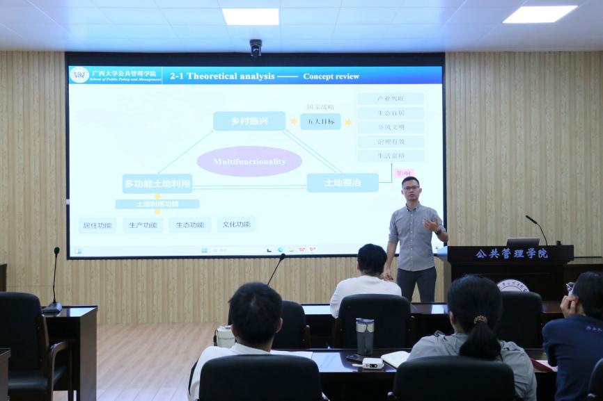 姜棪峰老师以“解读土地整治在乡村振兴中的作用”为题作课题分享,分为研究背景、研究方法、研究结果、总结与讨论四个部分。在研究背景部分,姜老师首先谈到了我国乡村面临的农村空心化、耕地破碎化等问题,强调了开展全域土地综合整治的重要性。他指出,全域土地综合整治包括“全空间”规划、“全要素”整治、“全产业”发展三个维度,分为建设用地整治、农用地整治、生态修复及未利用地开发等几种类型。目前来看,很少有研究从功能角度探讨土地整治与农村发展的供需关系,较少有村庄层面土地整治与乡村发展之间关系的对比性研究。据此,姜老师的研究提出了以下核心问题:土地整治在多大程度上促进了中国东部村庄的振兴,土地整治促进乡村振兴背后的机制是什么、有什么异同。