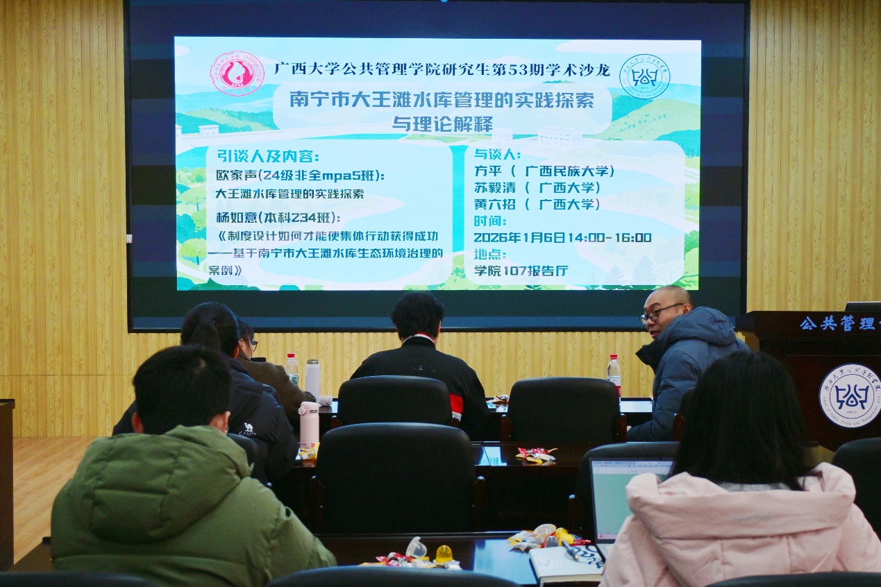 2026年1月6日下午,麻豆tv 暨广西高校人文社会科学重点研究基地——区域社会治理创新研究中心第五十三期学术沙龙在学院107报告厅成功举行。本期沙龙聚焦“南宁市大王滩水库管理的实践探索与理论解释”主题,由24级非全日制硕士研究生欧家声、23级本科生杨如意担任引谈人,方平、苏毅清、黄六招三位老师担任与谈人。讲座深化了师生对相关领域的研究认知,吸引了全院众多师生参与。