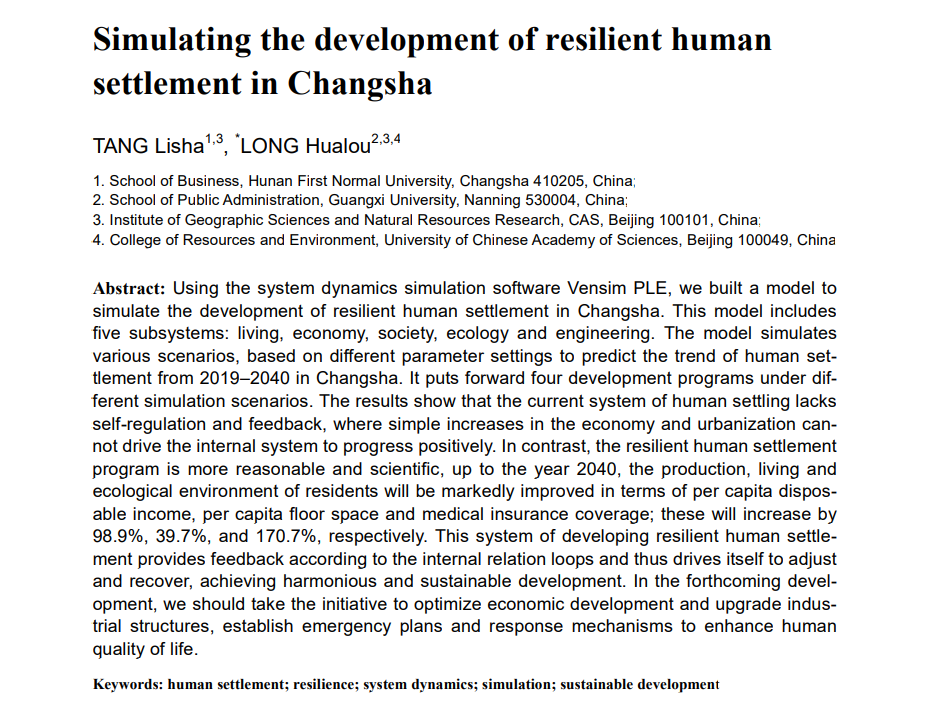 龙花楼以通讯作者身份在Journal of Geographical Sciences发文探讨长沙弹性人居环境的发展