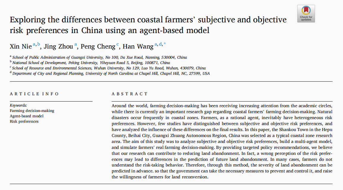 聂鑫、周静等在Journal of Rural Studies发文探讨利用基于代理的模型探索中国沿海农民的主观和客观风险偏好之间的差异