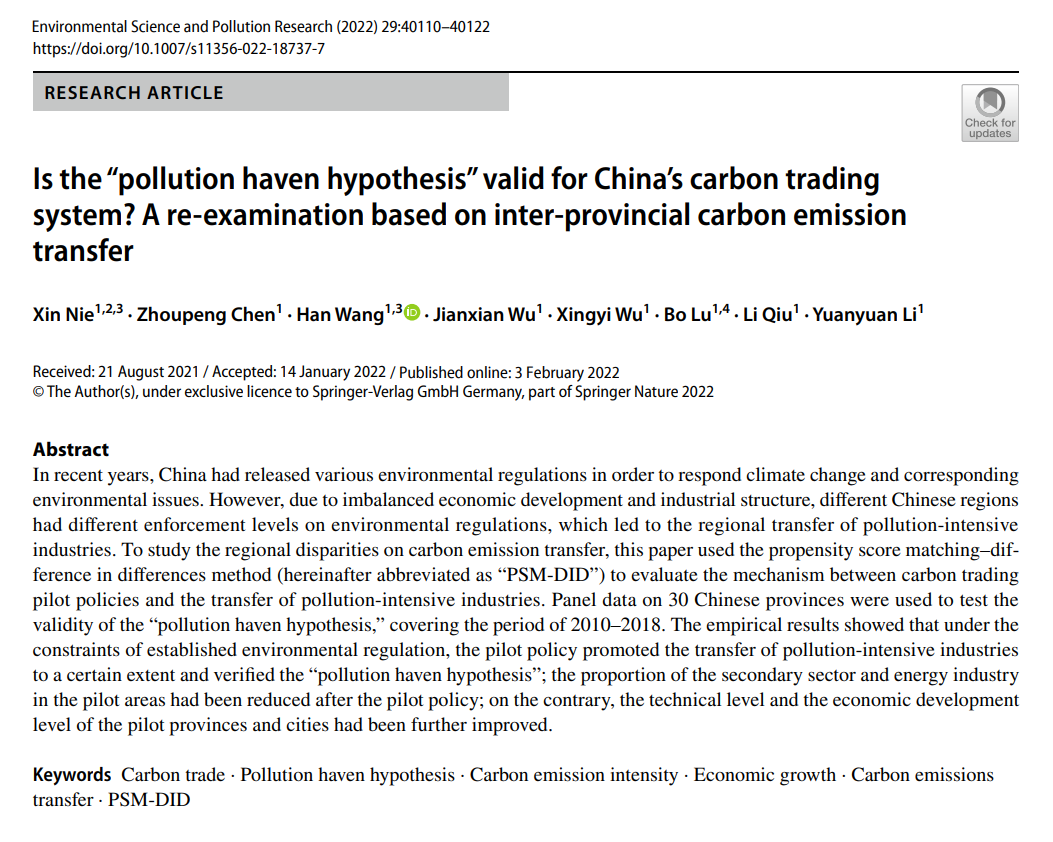聂鑫、汪晗在ESPR发文验证“污染避风港假说”对中国碳交易体系的有效性