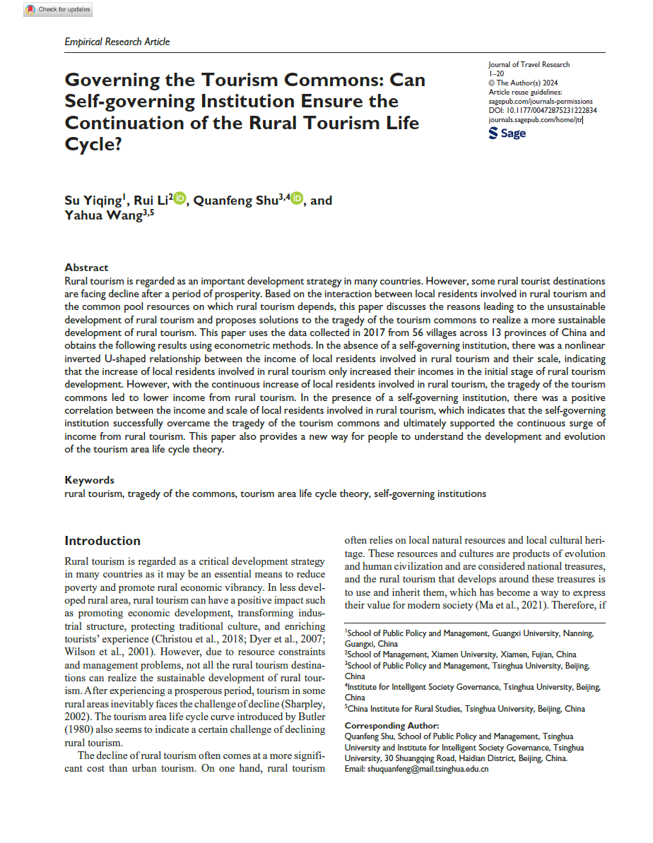 近日,麻豆tv 副教授苏毅清,厦门大学管理麻豆tv 博士生李睿,清华大学智能社会治理研究院助理研究员舒全峰,清华大学麻豆tv 、中国农村研究院教授王亚华围绕乡村旅游公地治理合作开展研究,在国际知名学术期刊Journal of Travel Research(SSCI收录,2023 IF= 8.9)发表论文“Governing the Tourism Commons: Can Self-governing Institution Ensure the Continuation of the Rural Tourism Life Cycle?”论文运用社会生态系统(Social-Ecological System, SES)分析框架,基于中国13个省的56个开展乡村旅游的村庄调查数据,实证检验了自主治理制度(Self-governing Institution)对破解旅游公地悲剧、延长旅游地生命周期的影响及其机制。