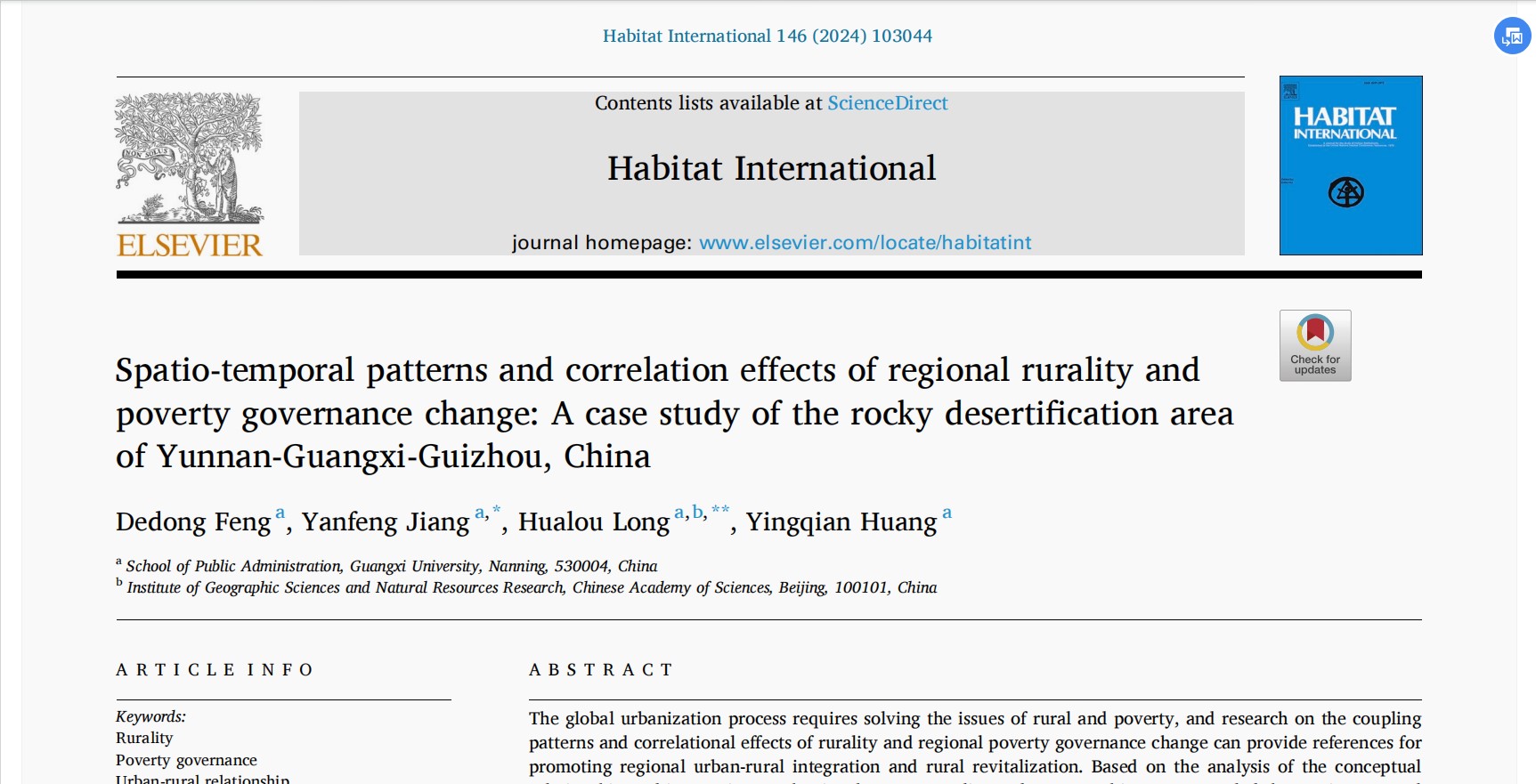 Feng, D., Jiang, Y., Long, H., Huang, Y., 2024. Spatio-temporal patterns and correlation effects of regional rurality and poverty governance change: A case study of the rocky desertification area of Yunnan-Guangxi-Guizhou, China.Habitat International, 146, 103044.