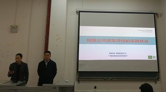 在报告会开始前,李小文副院长隆重地介绍了邢怀滨教授。邢怀滨教授是哲学硕士与博士,现挂任广西科技厅副厅长,国家科技部科技评估中心主任助理,主要从事科技创新政策与管理、公共政策评估等方面的管理和研究工作,出色的学历与工作背景让同学们不禁心生敬佩之意。