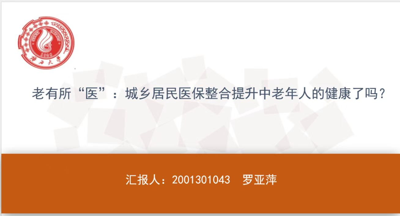 罗亚萍同学分享的论文是《老有所“医”:城乡医保整合提升中老年人的健康了吗?》,她从研究动机、理论与方法、实证结果和结论与讨论四个部分展开讲解。此研究以2016年《意见》的颁发为时间截点,基于中国健康与养老追踪调查(CHARLS)2015年和2018年两期全国追踪调查数据,利用倾向得分匹配-双重差分法(PSM-DID),分析城乡居民医保对中老年人健康、医疗服务利用的影响。在此基础上,进一步讨论城乡居民医保对城乡两地、不同收入水平、不同年龄段及不同性别中老年人健康的异质性影响。研究指出:城乡居民医保整合显著提升中老年人的自评健康、减少慢性病数量;城乡居民医保整合对中老年人的门诊次数、住院费用有一定的减少作用;相对来说,中年组、高收入组以及农村中老年人从城乡居民医保中获得的健康收益更大。
