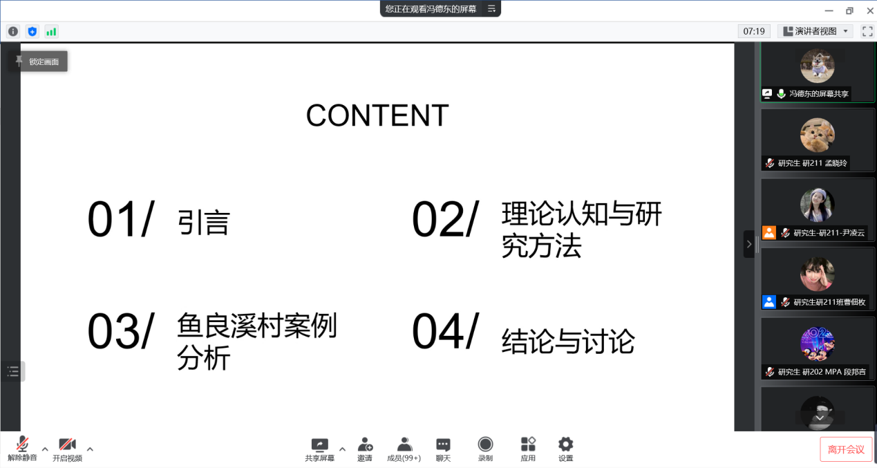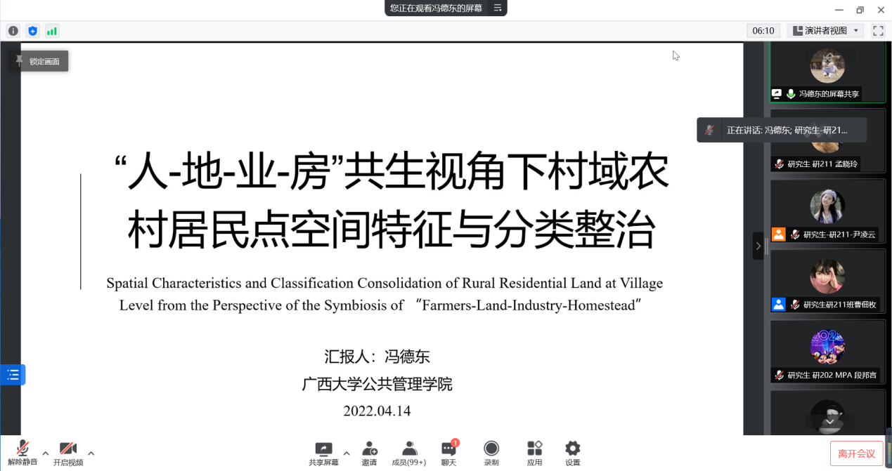 冯德东分享结束后,苏毅清老师进行了点评,指出案例研究要突出研究视角的优势性,提出从多维要素的“人-地-业-房”视角与传统视角进行比较分析,会更加突出案例的优势性所在;同时对文献综述提出新的要求。接着,黄六招老师也进行了点评,指出要在文章中体现出样本量,农村居民点共生水平评价指标测度的选取需加以说明,同时对研究结果加以讨论。