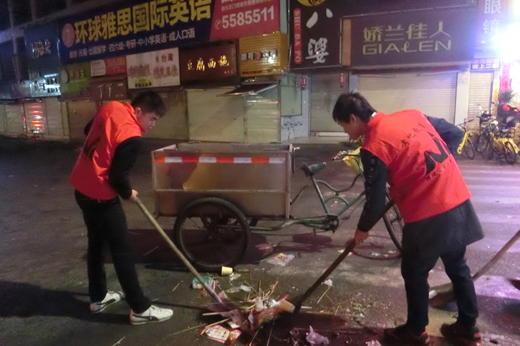 志愿者分为两批,清扫不同的区域。一些志愿者们生涩地拿着铲子将地上的垃圾铲入垃圾车,其他人便推着愈加沉重的垃圾车缓缓前行。环卫工人在一旁耐心的细心指导,工作井然有序地进行着。经过两个多小时的努力工作,志愿者和环卫工人们的额头上也早已挂上汗珠。天渐渐亮了,农院路也逐渐恢复了往日的干净整洁。