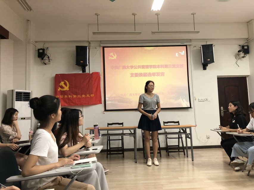 而后,支部进行了支委换届的选举发言。陈茜,符敏敏、谢秋萍、许蓝雪四位同志进行了竞选发言,四位同志对于支部建设都有自己的创新和见解。即将卸任的三位支委也对竞选的四名同志提出了要求和寄语,希望她们可以将本科第三党支部建设的越来越好。