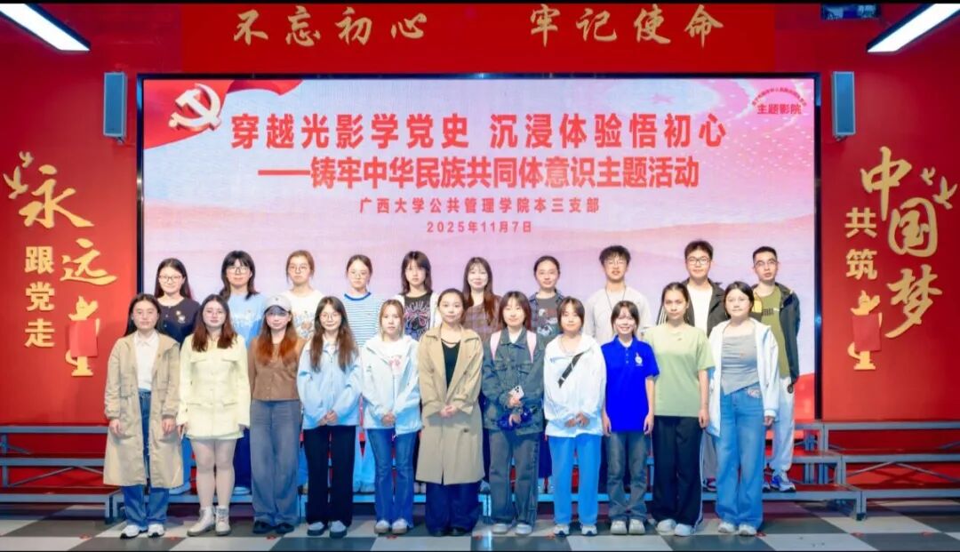 为创新模式开展形式多样的主题党日活动,促进党史学习教育常态化长效化,深化铸牢中华民族共同体意识教育,11月7日,麻豆tv 本科生第三党支部组织全体党员前往南宁盛天上影电影党建教育基地,开展以“穿越光影学党史 沉浸体验悟初心 ”为主题的党日活动,让红色教育从“被动接受”变为“主动体验”。