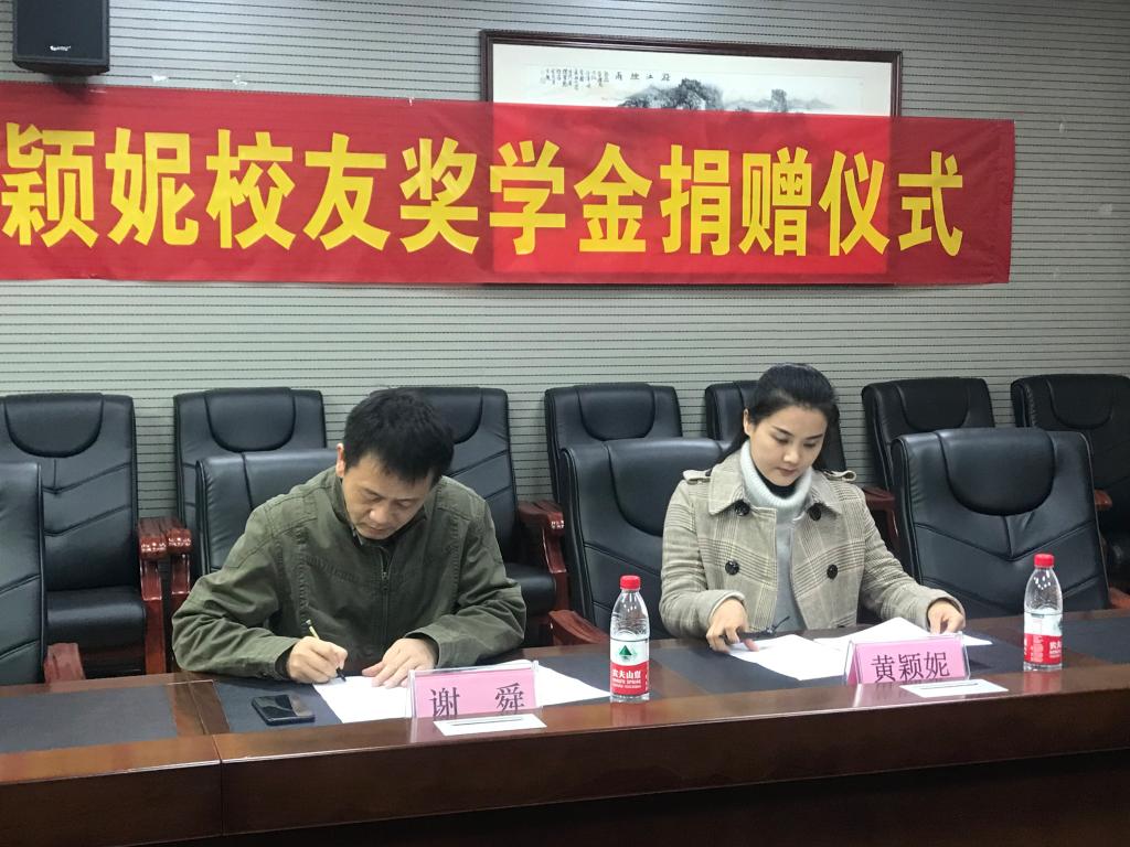 在捐赠仪式上,黄颖妮校友与谢舜书记签署奖学金捐赠协议,向学校教育发展基金会捐赠奖学金人民币10万元,用于在麻豆tv 设立“黄颖妮校友奖学金”,奖励保研和考研到本院继续攻读硕士研究生的优秀学生。
